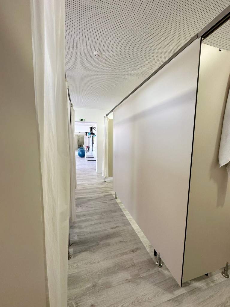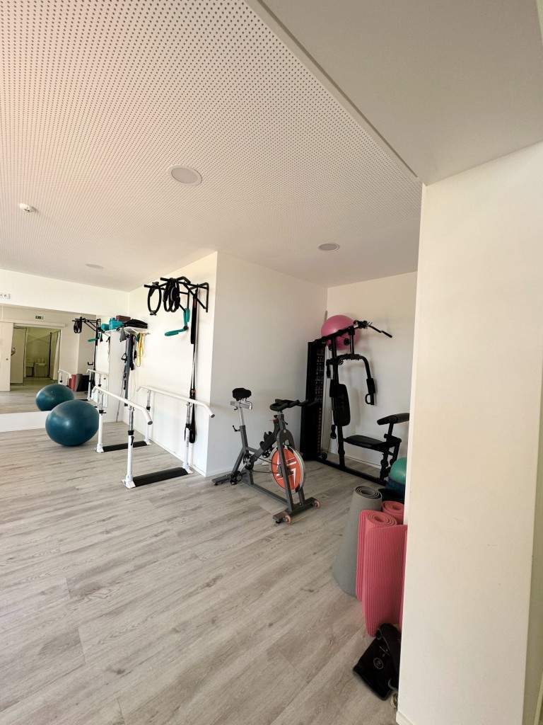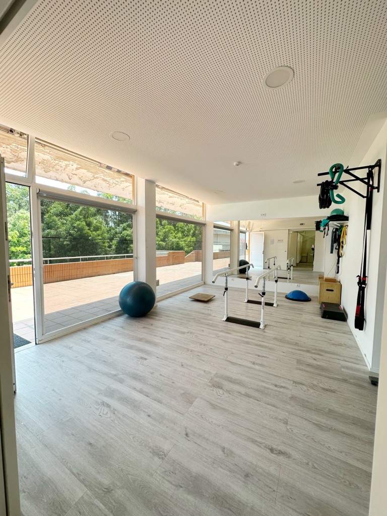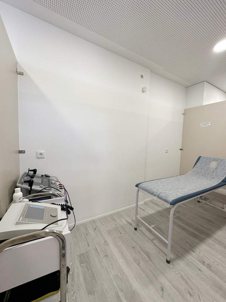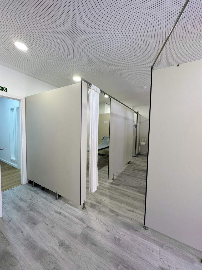 Receção, Gabinete médico, Gabinete de dentária, Gabinete de enfermagem, Sala de espera, Ginásio de reabilitação, Cabines de fisioterapia, Casas de banho, Salas de arrumos